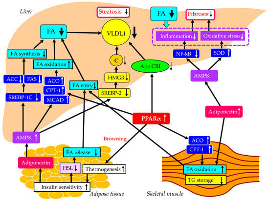 Elevated FA oxidation in the skeletal muscle and the reduced FA release from the adipose tissue by PPARα agonists decrease FA entry into the liver and may result in a reduction in hepatic VLDL production. PPARα agonists reduce hepatic TG synthesis by decreasing apo CIII production [96]. Furthermore, treatment with PPARα agonists simulated the expression of ACO and CPT-1, leading to an increase in FA oxidation and a decrease in hepatic TG storage [97].