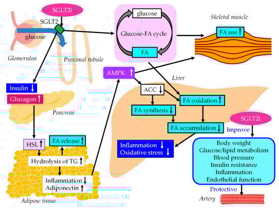 SGLT2i treatment shifted the energy metabolism towards FA utilization and elevated AMPK and ACC phosphorylation in skeletal muscle in diet-induced obese mice [129]. Furthermore, SGLT2i treatment induced a negative energy balance by excreting glucose into the urine, which may induce alteration of the glucose–FA cycle [130]. The fundamental concept of the glucose–FA cycle is the reciprocal substrate competition between glucose and FA in oxidative tissues such as skeletal muscles. SGLT2i-mediated alteration of the glucose–FA cycle may increase FA metabolism in the skeletal muscle. SGLT2i treatment reduces FA accumulation in liver, which reduces inflammation and oxidative stress and results in an improvement of MASLD.