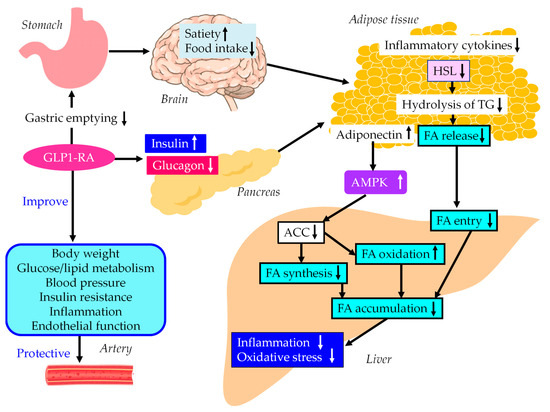 The underlying mechanisms for MASLD treatment and vascular protection using GLP-1RA are shown in Figure 4. GLP-1RAs increase pancreatic insulin secretion and decreases glucagon in a glucose-dependent manner and delays gastric emptying, which suppresses postprandial hyperglycemia and appetite, resulting in reductions in energy intake and body weight [141,142,143]. Intestinal GLP-1 is an endogenous satiation signal; its eating effects are primarily mediated by vagal afferents [144]. Increases in insulin secretion and decreases in glucagon secretion reduce HSL activity, resulting in decreases in the hydrolysis of TG and FA release from adipose tissue, which reduces FA entry to the liver.