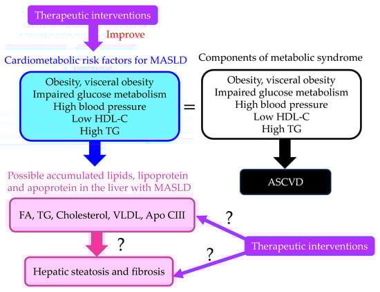 The summary of our review is shown in Figure 5. MASLD is a high-risk condition for both liver fibrosis and ASCVD. Therefore, therapeutic strategies to prevent both liver fibrosis and ASCVD are required for the treatment of MASLD. Therapeutic interventions that improve cardiometabolic risk factors may be beneficial for an improvement in MASLD. The effects of such therapeutic interventions on lipid, lipoprotein and apoprotein accumulation in the liver and on hepatic steatosis and fibrosis still remain unelucidated. Which lipid factor is crucial for developing MASLD also remains largely unknown. These issues should be studied in the future.