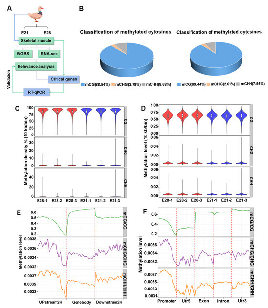 The skeletal muscles of duck embryos (E21 and E28) were collected for WGBS sequencing. WGBS was correlated with RNA-seq to screen for the essential genes and to validate their expression through RT-qPCR (Figure 1A). An examination of Bismark’s methylation sites revealed that the percentage of DNA methylation in the cytosine-guanine (CG) context ranged from 88.54% to 89.44% (Figure 1B). In comparison, DNA methylation in the CHG context fluctuated between 2.61% and 2.78%, and in the CHH context, it ranged from 7.95% to 8.68% (Figure 1B). The C loci of different contexts were analyzed for methylation density and genome-wide methylation levels. The genome methylation density was significantly different in the non-CG context, but it was not significantly different in the CG context. The genome methylation density in the CG context was >75% (Figure 1C). In contrast, the genome-wide methylation levels were not significantly different in the CG context and non-CG context, and the genome-wide methylation level in the CG context was >0.50 (Figure 1D).