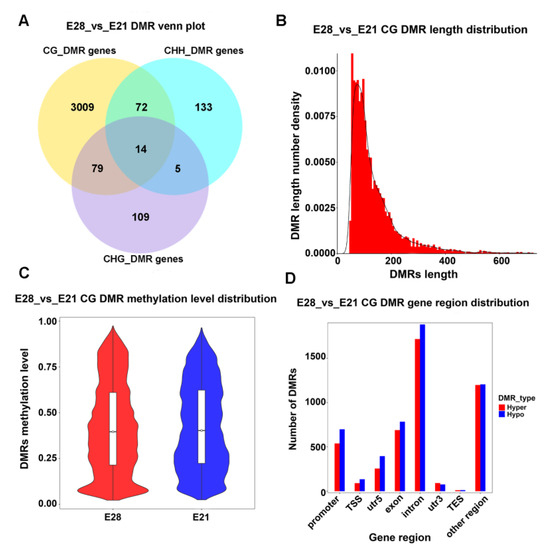 A total of 3421 differentially methylated genes (DMGs) were found by comparing the detected DMRs with the duck reference genome (GCA_015476345.1, NCBI) (Figure 2A). Among them, 3174 genes were differentially methylated in the CG context, 224 genes were found in the CHH context, and 207 genes were found in the CHG context (Figure 2A). Their lengths were distributed primarily between 100–200 bp in the CG context (Figure 2B). The distribution of methylation levels in the DMRs indicated that the average methylation level of duck skeletal muscle was between 0.50 and 0.85 in E21 and E28, with no significant difference (Figure 2C). Without considering other regions, the DMR analysis revealed that the intron region had the most DMRs, followed by the exon and promoter regions (Figure 2D).