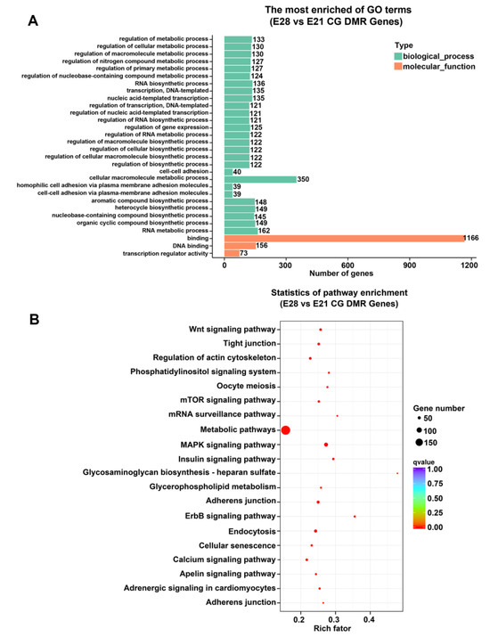 Functional enrichment analysis of DMGs. (A) Bar graph of the gene ontology (GO) enriched in the CG context. Classification statistics of enriched GO-related genes: The enriched GO term is plotted on the y-axis, and the number of DMR-related genes is on the x-axis. Biological processes and molecular functions are distinguished using various colors. (B) Scatterplot of Kyoto Encyclopedia of Genes and Genomes (KEGGs) metabolic pathways enriched in the CG context. The pathway name is represented on the vertical axis, and the rich factor is shown on the horizontal axis. The number of DMR-related genes in each pathway is denoted by the size of the points, and the color of the points corresponds to different q-values.