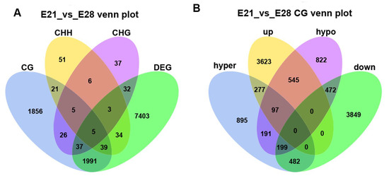 Association analysis of DNA methylation and gene expression. (A) Venn diagram of DMGs compared with DEGs. CG, CHG, and CHH represent DMGs in different contexts. (B) Venn diagram of DMGs compared with DEGs in the CG context. Hyper represents those genes anchored to the hyper-methylated regions, and hypo represents those genes anchored to the hypo-methylated regions; up represents highly expressed genes, and down represents lowly expressed genes.