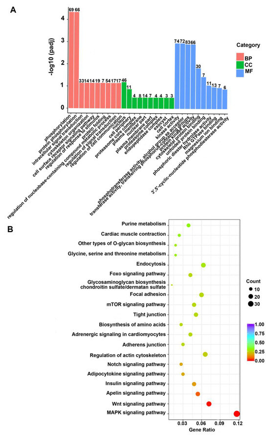 In order to enhance the comprehension of the potential functions of genes and pathways enriched in DMRs, the top 30 gene ontology (GO) terms were enriched significantly in the CG context. It showed that the DMGs were primarily enriched in biological processes, which included the regulation of metabolic processes, RNA biosynthesis, gene expression regulation, and cellular adhesion (Figure 3). Concurrently, the GO terms of molecular function were primarily enriched in those activities that regulated transcription and DNA binding (Figure 3A). The Kyoto Encyclopedia of Genes and Genomes (KEGGs) enrichment pathway analysis indicated that the DMGs were mostly enriched in metabolic signaling, MAPK signaling, adhesion, the regulation of actin cytoskeleton, Wnt signaling, autophagy, and mTOR signaling (Figure 3B).