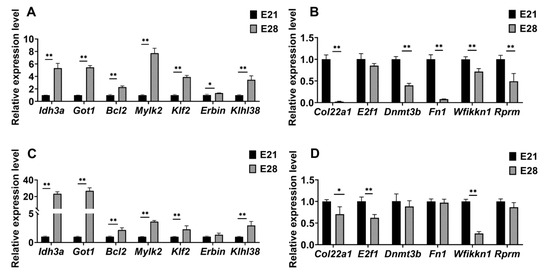 We used RT-qPCR to validate the expression levels of the genes selected above. The gene expression level displayed significant differences in PM at different developmental stages. Among them, the relative expression of Bcl2, Klf2, Klhl38, Idh3a, and Mylk2 in the PM was upregulated significantly (p < 0.01) (Figure 6A), whereas the relative expression of Col22a1, Dnmt3b, Fn1, E2f1, Rprm, and Wfikkn1 were downregulated significantly (p < 0.01) (Figure 6B). Similar gene expression patterns were observed in the LM when using RT-qPCR. The Duck embryonic LM exhibited differential expression levels for Idh3a, Got1, Bcl2, Mylk2, Klf2, and Klhl38 (p < 0.01) (Figure 6C). However, the difference in the relative expression level of Erbin was not significant (p > 0.05) (Figure 6C). Among the down-regulated genes, Col22a1, Wfikkn1, and E2f1 showed significant differences (p < 0.01), whereas Dnmt3b, Fn1, and Rprm exhibited significant differences in LM at different developmental stages (p > 0.05) (Figure 6D).