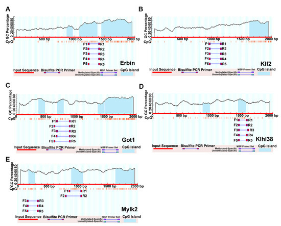 We used online software, MethPrimer (v1.0), to predict the existence of CpG islands on the promoters of the aforementioned genes. Among them, there were four CpG islands in the Erbin promoter region, with lengths of 104 bp, 118 bp, 182 bp, and 498 bp (Figure 7A). Klf2 contained one CpG island with a length of 246 bp (Figure 7B). Got1 appeared in four CpG islands, with total lengths of 110 bp, 107 bp, 107 bp, and 476 bp (Figure 7C). Klhl38 contained two CpG islands with lengths of 123 bp and 129 bp (Figure 7D), and Mylk2 included three CpG islands with lengths of 107 bp, 192 bp, and 341 bp (Figure 7E).