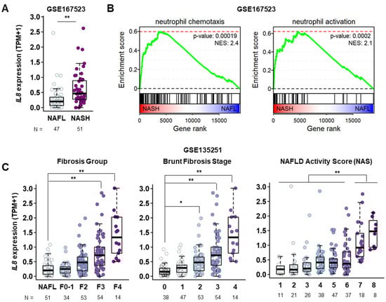 Elevated IL8 transcript levels in the course of NAFLD progression. (A) mRNA expression levels of the IL8 gene in the livers of patients with fatty liver (n = 47) and NASH (n = 51) from a publicly available RNA sequencing database (GSE167523). Statistical significance was assessed using Student’s t-tests (** p < 0.01). (B) GSEA plots showing the enrichment of genes associated with neutrophil chemotaxis and neutrophil activation in gene rank based on differential expression between NASH vs. NAFL livers. (C) mRNA expression levels of the IL8 gene in the liver among different stages of NAFLD obtained from a publicly available RNA sequencing database (GSE135251). F0–F1, F2, F3, and F4 represent different NASH groups classified by the severity of fibrosis. TPM refers to transcripts per million base pairs. For comparisons involving more than three groups, a one-way analysis of variance (ANOVA) was conducted, followed by post-hoc Tukey’s tests to determine specific group differences. (* p < 0.05, ** p < 0.01). IL8, interleukin 8; GSEA, gene set enrichment analysis; NAS, NAFLD activity score; NAFLD, nonalcoholic fatty liver disease; NASH, nonalcoholic steatohepatitis.