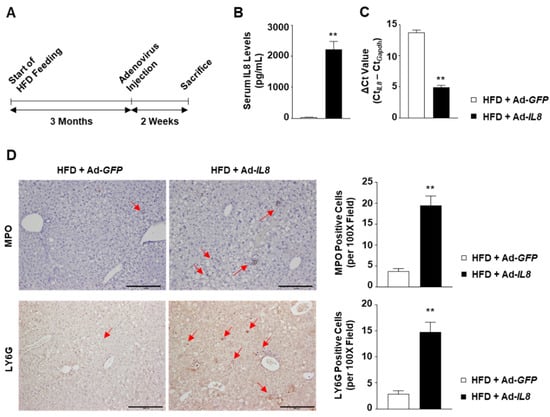 As elevated IL8 expression is correlated with NASH severity, we subsequently examined the potential role of IL8 in NASH progression. Accordingly, C57BL/6 mice fed an HFD for 3 months to induce fatty liver were subsequently infected with an adenovirus overexpressing the human IL8 gene (Ad-IL8) or a control virus expressing GFP (Ad-GFP) (Figure 2A). Tail vein injection of Ad-IL8 increased serum IL8 levels up to 2200 pg/mL at 2 weeks post-infection (Figure 2B). Furthermore, reverse transcription-quantitative polymerase chain reaction (RT-qPCR) analysis revealed that Ad-IL8 infection resulted in the overexpression of human IL8 in the livers of mice (Figure 2C). Immunohistochemical analysis revealed that hepatic IL8 overexpression increased the number of cells positive for either of two neutrophil-specific markers, myeloperoxidase (MPO) or LY6G, in the liver (Figure 2D). Collectively, these findings indicate that IL8 overexpression could induce hepatic neutrophil infiltration.