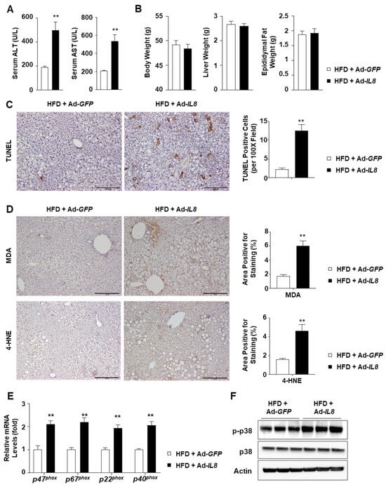 Subsequently, we analyzed the liver injury parameters to determine the consequences of hepatic IL8 overexpression and subsequent neutrophil recruitment. IL8 overexpression exacerbated liver injury, as indicated by elevated serum alanine transaminase (ALT) and aspartate transaminase (AST) levels (Figure 3A), whereas the body, liver, and epididymal fat weights were unaffected (Figure 3B). IL8 overexpression-induced exacerbated liver injury was further confirmed by terminal deoxynucleotidyl transferase dUTP nick-end labeling (TUNEL) (Figure 3C) as well as hematoxylin and eosin staining (Supplementary Figure S2). To elucidate the potential mechanism underlying IL8-induced liver injury, we conducted immunohistochemical analyses of malondialdehyde (MDA) and 4-hydroxynonenal (4-HNE), both of which are known indicators of lipid peroxidation that form adducts with proteins [29,30]. IL8 overexpression increased the MDA- and 4-HNE-positive areas in the livers of HFD-fed mice (Figure 3D). Neutrophil oxidative burst is a critical process that contributes to ROS production by neutrophils. NADPH oxidase 2 (NOX2) is critical for ROS production by neutrophils and requires the formation of the NOX2 complex for activation, which comprises p47phox, p67phox, p40phox, and p22phox. IL8 overexpression increased the mRNA levels of NOX2 complex members (Figure 3E). Phosphorylation of a stress kinase, p38, was also enhanced by IL8 overexpression (Figure 3F). Taken together, these findings suggest that IL8-driven neutrophil infiltration could enhance hepatic oxidative stress, presumably in association with neutrophil oxidative burst.
