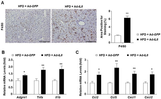 We further explored the inflammatory features in the livers of IL8-overexpressing mice to examine the effect of IL8 overexpression on the development of NASH-like phenotypes. In HFD-fed mice overexpressing IL8, F4/80 staining revealed increased formation of macrophage aggregates, known as hepatic crown-like structures, around lipid-laden hepatocytes, a hallmark of NASH-associated inflammation [31] (Figure 4A). Additionally, Ad-IL8 infection increased the mRNA levels of inflammatory genes such as Adgre1 (the gene encoding F4/80), Tnfa, and Il1b in the livers of HFD-fed mice (Figure 4B). Moreover, IL8 overexpression enhanced the mRNA expression of chemokine genes, such as Ccl2, Ccl5, Cxcl1, and Cxcl2, which induce monocyte and neutrophil chemotaxis (Figure 4C). Collectively, these findings demonstrate that IL8 overexpression could exacerbate hepatic inflammation, inducing the transition from fatty liver to NASH.