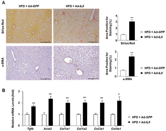 Having confirmed that IL8 overexpression promoted hepatic inflammation in HFD-fed mice, we subsequently explored whether these mice exhibited increased fibrosis. Sirius red staining of the mouse livers revealed that IL8 overexpression increased collagen deposition in the livers of HFD-fed mice (Figure 5A). Moreover, immunohistochemical analysis showed that Ad-IL8-infection increased levels of alpha-smooth muscle actin (α-SMA), a marker indicating the transdifferentiation of hepatic stellate cells into myofibroblasts. These histological findings were further substantiated by RT-qPCR analysis of key fibrogenic genes, including Tgfb, Acta2 (encoding α-SMA), Col1a1, Col1a2, Col3a1, and Col4a1 (Figure 5B). Collectively, our results suggest that IL8 overexpression in mice with fatty livers promotes fibrosis, a prominent characteristic of NASH.