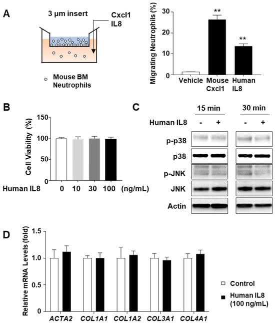 Considering that mice lack the equivalent IL8 gene found in humans, we investigated whether mouse neutrophils could respond to the human IL8 recombinant protein. The chemotaxis assay results showed that human IL8 stimulated neutrophil migration through Transwell chambers (pore size 3 μm), albeit to a lesser extent than the mouse Cxcl1 recombinant protein (Figure 6A). Based on this observation, we subsequently explored whether the NASH-associated characteristics observed in IL8-overexpressing mice could be directly attributed to IL8 itself, independent of infiltrating neutrophils. To verify this hypothesis, we treated AML12 hepatocytes with IL8 recombinant protein, subsequently evaluating the phosphorylation status of stress kinases, including p38 and JNK, which have been reported to be associated with hepatocyte death and activation in experimental NASH models [26]. However, IL8 treatment did not impact cell death (Figure 6B) or phosphorylation of p38 or JNK (Figure 6C). Similarly, treatment of LX-2 stellate cells with IL8 recombinant protein did not increase the mRNA levels of fibrogenic genes, such as ACTA2, COL1A1, COL1A2, COL3A1, and COL4A1 (Figure 6D). In addition, treatment with mouse CXCL1 recombinant protein, the mouse homolog of IL8, failed to affect the phosphorylation of p38 or JNK in AML12 cells (Supplementary Figure S3). Accordingly, these findings suggest that the Ad-IL8 infection-induced NASH progression might not be directly driven by IL8 but may involve other factors, such as neutrophil infiltration.
