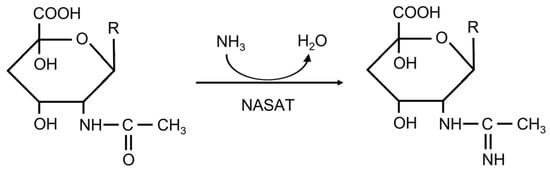 According to previous studies, WbpG, a member of NASAT family in Pseudomonas aeruginosa O5, is responsible for forming the C-3 acetiminido group on the first sugar residue of the O-unit to produce DManNAc3NAmA [7,8]. WbuX in E. coli O145 is a homolog of WbpG, which is involved in the amination of L-FucNAc for the synthesis of L-FucNAm [9]. However, while NASAT is indispensable for generating bacterial LPS specificity, surprisingly little is known about its structural and functional properties.