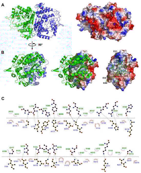 According to the analysis of LIGPLOT [19], the dimer interfaces reveal an extensive network of interactions that involves hydrogen bonds and hydrophobic contacts (Figure 3B,C). Residues Gly113, Lys135, Ile164, His165, Asp169, Asn170, His171, Leu172, Thr174, Asn176, Gly177, Arg178, Arg181, Tyr205, Gln271, Asp272, Glu311 and Lys399 involve in direct hydrogen bonds. Besides, residues Ser114, Tyr115, Asn141, Tyr152, Trp157, Ala166, Gly167, Phe168, Phe173, Pro175, Met209, Leu212, His213, Asp270, Asp274, Glu311 and His312 contribute to a large number of hydrophobic interactions. There is also a small number of water-molecule-mediated hydrogen bonding interactions at the dimerization interface. These interactions together stabilize the structure of the dimer. However, the vast majority of these residues are not conserved among the NASAT family members (Figure 2B and Figure S4), suggesting that proteins in this family may not necessarily require dimerization to function.