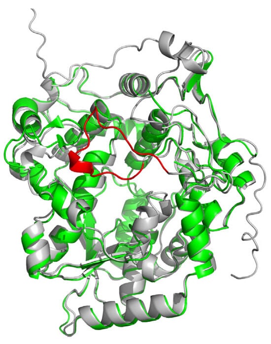 Superposition of the crystal structure (PDB code 8WEX, green) and AlphaFold-predicted structure (grey) of LpNASAT. The fragment (residues 56–69) is shown in red.