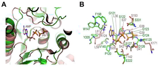 Superposition of the ligand-binding site of FtNadE and LpNASAT. (A) The PP-loop of FtNadE in complex with the products of ATP hydrolysis (PDB code 3fiu, orange) and LpNASAT (PDB code 8WEX, green). (B) Close-up view of the nucleotide-binding site. The amino acid residues, which are involved in FtNadE-AMP-PPi binding, are shown in orange. Residues of LpNASAT at positions equivalent to those of FtNadE are shown in green.