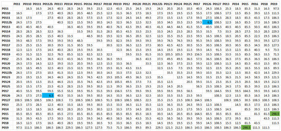The difference in cM between the positions of the extremes of the haplotype shared by each pair of individuals, representing the segment length, was then computed. The number of generations based on the simulation applied to the distance matrix in cM is shown in Figure 2. The generated matrix is first converted into generations, and then into the number of meioses separating each pair of individuals (Figure 2). The maximum length (20.85 cM) was obtained for the pair P0126-P0112b. This segment encompasses almost the entire chromosomal region analyzed; it indicates a recent common ancestor between these two individuals, living approximately six or seven generations ago (blue boxes, Figure 2). Otherwise, the shortest feature length (0.42 cM) was observed between P019–P015, indicating a distant common ancestor living 300 generations ago (green boxes, Figure 2).