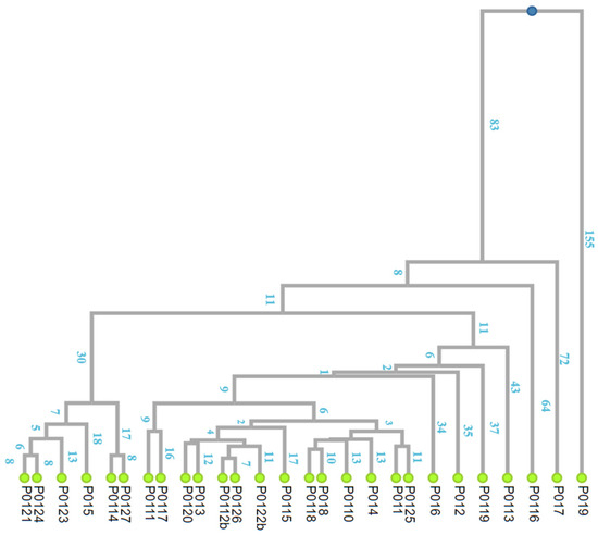 Following Marroni’s phylogenetic method [18], the similarity matrix of segment length (cM) shared by all pairs of variant carriers was converted by computer simulation into the number of generations separating each pair. This number was then doubled to express the amount of meiosis. The resulting distance matrix was subjected to UPGMA [44] clustering, a simple hierarchical clustering method that generates dendrograms by successive steps starting from a distance matrix (Figure 3). For this purpose, the online software DendroUPGMA was used (http://genomes.urv.cat/UPGMA/, accessed on 1 October 2023).