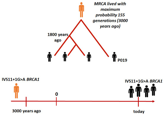 In our work, using the haplotype sharing method, we confirmed the hypothesis of a founder effect for this variant in the Tuscany region. Indeed, all the individuals analyzed share a minimum common haplotype around the BRCA1 gene. The analysis also showed that P019 was the most distant individual from all other carriers. He shares a very short haplotype segment with them, on average 0.9 cM in size. This length suggests that the most recent common ancestor lived about 155 generations ago—3000 years ago.