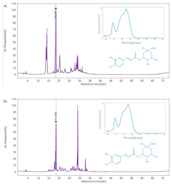 HPLC chromatograms of hydroethanolic extracts of black chokeberry fruits (a) and bilberry fruits (b) with UV-spectrum of chlorogenic acid recorded at 320 nm.