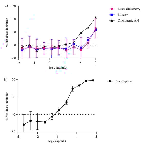 Dose–response curves of Src kinase inhibition for black chokeberry fruits, bilberry fruits, chlorogenic acid (a) and staurosporine (b).
