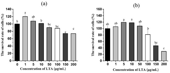 (a) Cell survival of MH-S cells after 12 h stimulation with different concentrations of LTA. (b) Cell survival after 24 h of LTA stimulation of MH-S cells at different concentrations. Different lowercase letters on the error bars indicate statistically significant differences (p < 0.05).