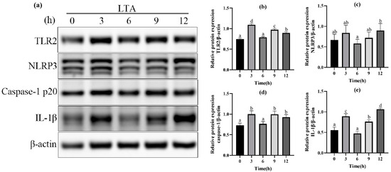 In order to further determine the optimal stimulation time of MH-S cells induced by LTA, different stimulation times (0, 3, 6, 9, 12 h) of LTA with the final concentration of 200 μg/mL were used. The protein expressions of TLR-2, NLRP3, Caspase-1 and IL-1β in MH-S cells were detected using Western blot, and are shown in Figure 3. The results showed that when LTA stimulated MH-S cells for 3 h and 12 h, compared with the blank group, the protein expression of TLR2, Caspase-1 and IL-1β was significantly up-regulated (p < 0.05); NLRP3 protein expression was up-regulated in MH-S cells stimulated by LTA for 3 h and 12 h, but the difference was not significant compared with the blank control group (p < 0.05). The protein expressions of TLR2 and Caspase-1 peaked at 3 h after LTA stimulation, and those of NLRP3 and IL-1β peaked at 12 h after LTA stimulation. In conclusion, we selected 200 μg/mL LTA to stimulate MH-S cells for 12 h to establish the cell inflammation model.