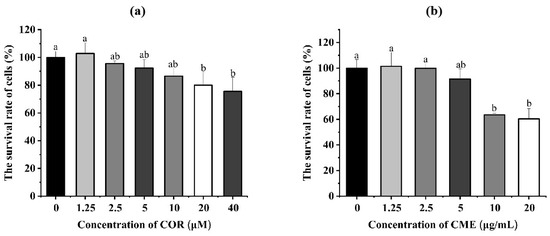 (a) Cell viability of MH-S cells treated with different concentrations of CME for 12 h. (b) Cell viability of MH-S cells treated with different concentrations of COR for 12 h; different lowercase letters above error bars indicate statistically significant differences (p < 0.05).