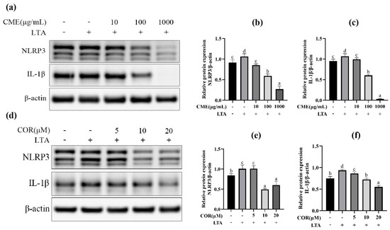 The effect on protein of different concentration of CME and COR. (a) Western blot band of CME; the relative expression of (b) NLRP3, (c) IL-1β, (d) Western blot band of COR. The relative expression of (e) NLRP3, (f) IL-1β. Different lowercase letters above error bars indicate statistically significant differences (p < 0.05).