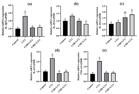 RT-PCR was used to detect the effects of COR and CME on MH-S cells, and the mRNA expression of inflammatory factors (IL-1β, IL-18, IL-10, IL-6 and TNF-α) in the supernatant of MH-S cells stimulated by LTA. Results as shown in Figure 7 show that, compared with the blank control group, LTA significantly stimulated the mRNA expression of IL-1β, IL-18, IL-6 and TNF-α in cells (p < 0.05). Compared with the LTA model group, COR and CME pretreatment significantly decreased the mRNA expression of IL-1β, IL-18, IL-6 and TNF-α in cells (p < 0.05), and the mRNA expression levels of IL-1β, IL-6 and TNF-α were not significantly different from those of the blank group (p > 0.05). There was no significant difference between CME and COR pretreatment on the inhibition of MH-S cell inflammatory factors induced by LTA (p > 0.05).