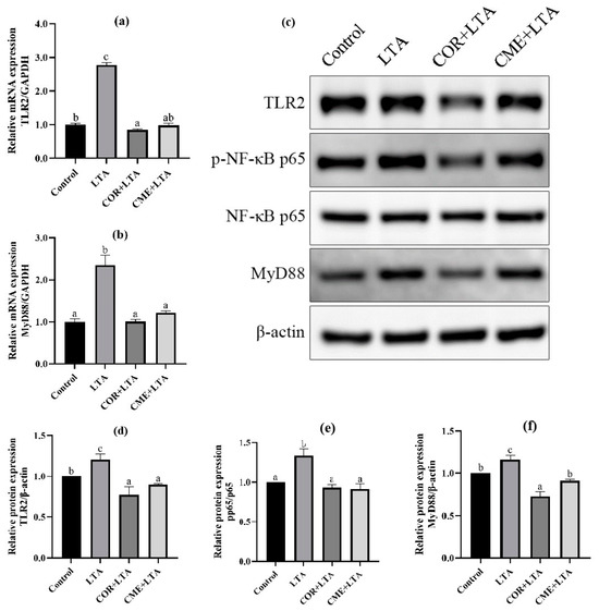 WB detection was used to further determine whether CME and COR pretreatment could affect the expression of TLR2/NF-κB signaling pathway-related proteins to inhibit cell inflammatory damage. The Western blot banding can be seen in Figure 8c. The protein expression levels of the TLR2 receptor and MyD88 increased significantly after LTA stimulation, and the p-p65/p65 ratio increased significantly, indicating that LTA activated the expression of TLR2 and MyD88 proteins, increased the phosphorylation of p65, and was subsequently transferred to the nucleus [34,35], thereby causing inflammation in the MH-S cells. Not surprisingly, COR and CME significantly decreased the expression of TLR2 and MyD88 proteins (p < 0.05), and then inhibited the phosphorylation of p65 so that the p-p65/p65 ratio would reach the normal level, and there was no significant difference from the normal control group (p > 0.05). The results show that CME can reduce inflammatory damage by inhibiting the activation of TLR2 and NF-κB signaling pathways. In addition, the anti-inflammatory capacity of CME was better than COR, but not significantly.