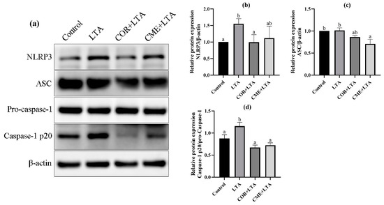 In order to investigate whether CME alleviates LTA-induced inflammatory damage in MH-S cells by inhibiting the NLRP3 inflammasome complex, the protein expressions of NLRP3, ASC and Caspase-1 in MH-S cells were detected using the WB assay. As shown in Figure 9, LTA stimulation of MH-S cells significantly upregulated the NLRP3 protein (p < 0.05) and promoted the expression of the ASC protein (p > 0.05). The Caspase-1 p20/Pro-Caspase-1 ratio was significantly increased (p < 0.05), activating the NLRP3/ASC pathway. CME inhibited the expression of the NLRP3 protein induced by LTA and significantly decreased the expression of the ASC protein (p < 0.05). The Caspase-1 p20/Pro-Caspase-1 ratio was significantly reduced to that of the blank control group (p < 0.05); COR reduced NLRP3 protein expression and the Caspase-1 p20/Pro-Caspase-1 ratio in MH-S cells induced by LTA was reduced to a normal level, showing no significant difference compared with the blank control group (p > 0.05). The results showed that both COR and CME inhibited the activation of Caspase-1 and interfered with the function of NLRP3 inflammasome.