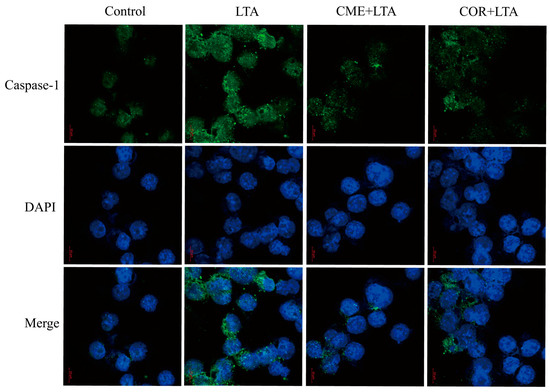 In order to further demonstrate the effect of CME on LTA-induced Caspase-1 activation of MH-S cells, the expression of Caspase-1 in the blank control group, the LTA model group and MH-S cells pretreated with CME and COR for 3 h was detected using the immunofluorescence assay. As shown in Figure 10, compared with the blank control group, LTA significantly induced the formation of perinuclear fluorescence spots of Caspase-1 in MH-S cells. Compared with the LTA group, both CME and COR can reduce the formation of perinuclear fluorescent spots. In conclusion, CME and COR can inhibit the Caspase-1 activation of MH-S cells induced by LTA, which is consistent with the WB results.