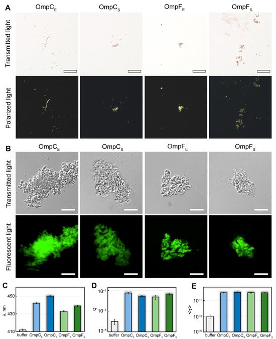 Interaction of OmpC and OmpF aggregates with CR and ThT dyes. (A) Polarized light microscopy of the Omp aggregates stained with CR. Top row: transmitted light; bottom: polarized light. The scale bar is equal to 50 μm. (B) Confocal microscopy of the Omp aggregates stained with Thioflavin T (ThT). Top row: transmitted light; bottom: fluorescent light. The scale bars are equal to 10 μm. (C) Wavelength of the absorption spectrum maximum (λ), (D) fluorescence quantum yield (q), and (E) fluorescence lifetime (<τ>) of ThT bound to Omp fibrils. Characteristics of ThT in the buffer are given as a control. Designations “E” and “S” in the names of proteins correspond to the orthologs from E. coli and S. enterica, respectively.
