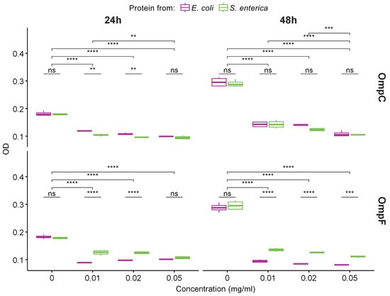 Since we demonstrated that OmpC and OmpF fibrils represent bona fide amyloids, we decided to analyze their toxicity to mammalian cells. Various amyloids are known to show toxicity to eukaryotic cells, which occurs mainly due to the ability of amyloid fibrils to bind cell membranes, leading to their disruption and cell death [49]. We tested the toxicity of fibrils formed by OmpC and OmpF of E. coli and S. enterica in vitro against human monocytic leukemia THP-1 cells (ATCC TIB-202). We used different concentrations of fibrils and two times of incubation: 24 and 48 h. All experiments were quadruplicated. The analysis of cells’ viability performed using the MTT assay (see “Section 4”) demonstrated that all four variants of fibrils caused statistically significant toxicity effects (Figure 4). Notably, E. coli and S. enterica OmpC fibrils showed the same toxicity, whereas the fibrils of the E. coli OmpF were more toxic than the fibrils formed by its ortholog from S. enterica (Figure 4). However, E. coli OmpC fibrils are less toxic than E. coli OmpF fibrils; this effect is cumulative and is better seen within 48 h. For S. enterica Omps, OmpC fibrils are more toxic than OmpF fibrils at first, but they level off after 48 h (Figure S3).