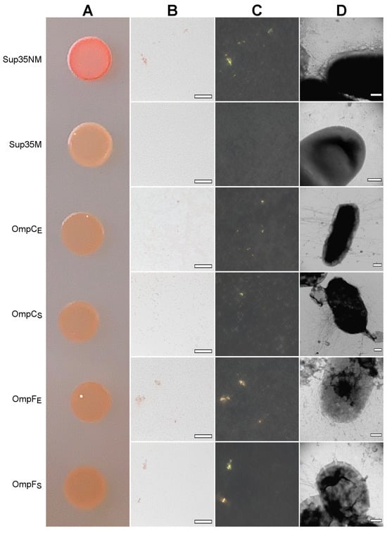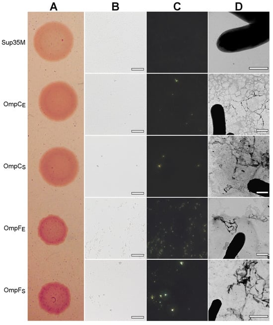 We found that all four analyzed Omps form bona fide amyloids in vitro. Next, we tested whether these proteins form amyloids that are heterologously secreted to the surface of E. coli cells using the C-DAG (Curli-Dependent Amyloid Generator) system [50]. As a result of this experiment, we have found that overexpression of all analyzed proteins, OmpC and OmpF from E. coli and S. enterica, in the E. coli strain VS39 has the same phenotypic manifestation, resulting in the orange color of colonies on the plates with cultural media containing CR (see “Section 4”). Such a phenotype suggests that VS39 cells secreting proteins of interest bind CR (Figure 5A). Polarized light microscopy of colonies confirmed this observation. Indeed, VS39 colonies secreting Omps contained congophylic deposits (Figure 5B) that, in contrast to the negative control (VS39 cells secreting soluble Sup35M protein), exhibited birefringence under polarized light (Figure 5C). While both samples secreting OmpC proteins from E. coli and S. enterica mostly contained relatively small CR-positive deposits, the samples secreting OmpF proteins from E. coli and S. enterica contained larger deposits similar to the positive control (VS39 secreting Sup35NM amyloid) (Figure 5C). Examination of colonies by transmission electron microscopy (TEM) confirmed amyloid fibril formation by VS39 cells secreting all four Omps: these cells, in contrast to the negative control (cells secreting Sup35M), contained long, thin fibrils at their surfaces (Figure 5D).