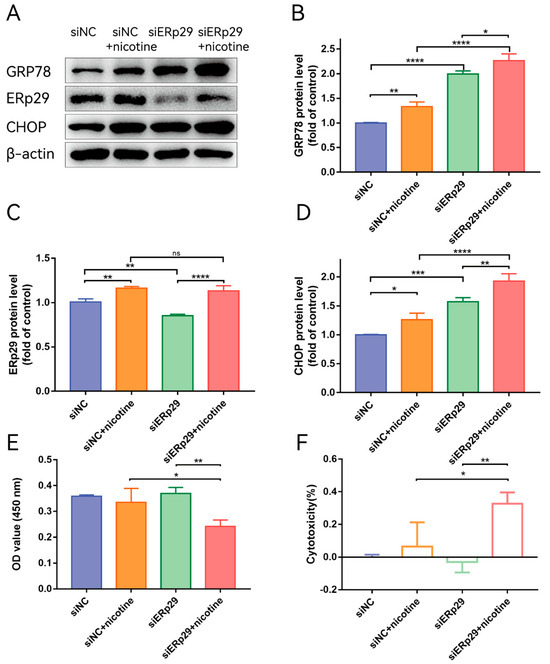 (A) Western blot showing the expression of GRP78, ERp29, and CHOP in each group. (B–D) The histogram shows the densitometric analysis of the average levels of GRP78, ERp29, and CHOP normalized to β-actin (n = 3). (E,F) CCK-8 assays demonstrated that ERp29 deficiency increased the cytotoxic effects of nicotine in ARPE-19 cells. The data are presented as the mean ± SEM. * p < 0.05, ** p < 0.01, *** p < 0.001; **** p < 0.0001. ns, no statistical significance.