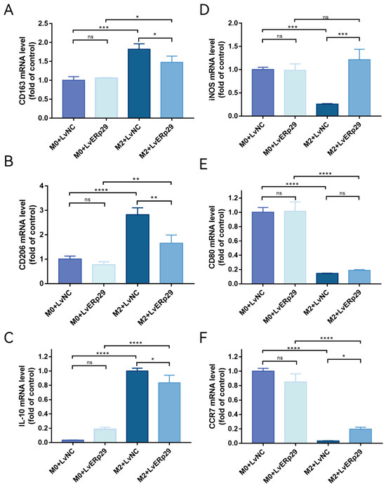 (A–C) qPCR showed the expression of the M2 macrophage markers CD163, CD206, and IL-10 in each group. (D–F) qPCR showed the expression of iNOS, CD80, and CCR7, which are M1 macrophage markers, in each group. The data are presented as the mean ± SEM of three independent experiments. * p < 0.05; ** p < 0.01; *** p < 0.001; **** p < 0.0001. ns, no statistical significance.