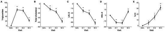 (A–E) Mean percentage change in lipoproteins over time. * p < 0.05, ** p < 0.001.