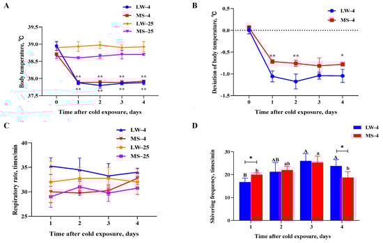 Physiological response patterns of (A) body temperature (significant difference analysis was performed on the same breed at different temperatures), (B) body temperature deviation, (C) respiratory rate, and (D) shivering frequency in LW and MS pigs exposed to temperatures of 25 °C and 4 °C for four days. The results were expressed as mean ± SEM (n = 3). Statistical significance was determined using the two-tailed unpaired Student’s t-test, with ** p < 0.01 and * p < 0.05 denoting significance. A,B Different capital letters represent significant differences in LW pigs at 4 °C (p < 0.05). a,b Different lowercase letters represent significant differences in MS pigs at 4 °C (p < 0.05). LW and MS represent Large White pigs and Mashen pigs, respectively; 25 and 4 indicate 25 °C and 4 °C, respectively.