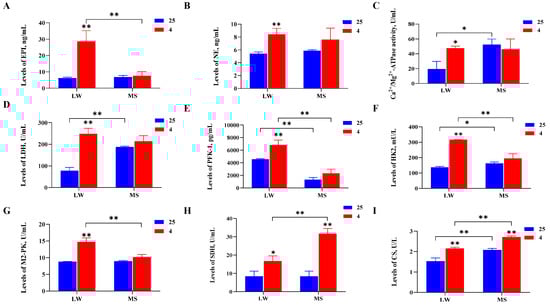 Serum biochemistry and hormone analyses of (A) epinephrine (EPI), (B) norepinephrine (NE), (C) Ca2+/Mg2+-ATPase, (D) lactate dehydrogenase (LDH), (E) phosphofructokinase 1 (PFK-1), (F) hexokinase 2 (HK2), (G) pyruvate kinase M2 isoenzyme (M2-PK), (H) succinate dehydrogenase (SDH), and (I) citrate synthase (CS) in LW and MS pigs at 25 °C and 4 °C. The results are presented as mean ± SEM (n = 3). LW and MS refer to Large White pigs and Mashen pigs, respectively; 25 and 4 refer to 25 °C and 4 °C, respectively. p values were determined using the two-tailed unpaired Student’s t-test, ** p < 0.01; * p < 0.05.