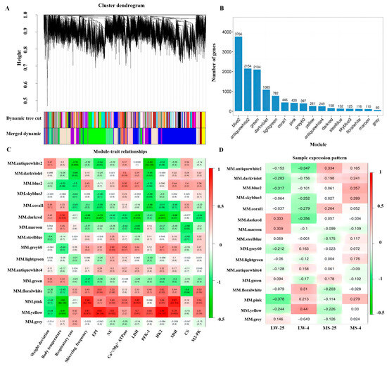 Weighted co-expression network analysis of all genes. (A) Gene hierarchical clustering partition module. Different colors represent different modules. (B) Histogram showing the number of genes in each module. (C) Correlation analysis between modules and phenotypes. (D) Correlation analysis between modules and groups. The color range of the heat map ranges from green (low expression) to red (high expression). LW and MS represent Large White pigs and Mashen pigs, respectively; 25 and 4 indicate 25 °C and 4 °C, respectively.