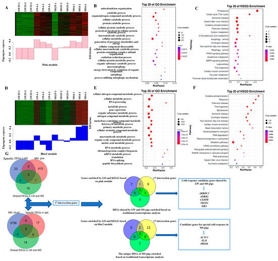 The expression patterns and functional analysis of genes in the co-expression modules. (A) The expression pattern of genes in the pink module. (B) Gene Ontology (GO) analysis of genes in the pink module. (C) Kyoto Encyclopedia of Genes and Genomes (KEGG) enrichment analysis of genes in the pink module. (D) The expression pattern of genes in the blue2 module. (E) GO analysis of genes in the blue2 module. (F) KEGG enrichment analysis of genes in the blue2 module. (G) Combined results of traditional transcriptomics analysis and weighted co-expression network analysis (WGCNA) to screen common and specific candidate genes responding to cold response in LW and MS pigs. The heat map color scale indicates expression levels, ranging from blue (low expression) to red (high expression). LW and MS denote Large White pigs and Mashen pigs, respectively; 25 and 4 represent 25 °C and 4 °C, respectively.