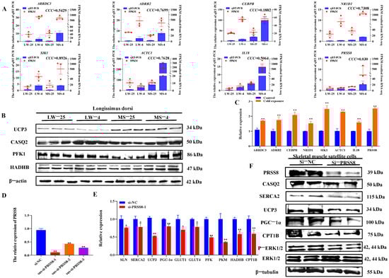Validation results of common and specific cold-responsive candidate genes in pig longissimus dorsi muscle tissue and satellite cells. (A) qRT-PCR verification of candidate genes in the longissimus dorsi muscle tissue of LW and MS pigs at 25 °C and 4 °C. The left y-axis and blue bars represent the relative expression levels of eight candidate genes in qRT-PCR, and the right y-axis and red bars represent the FPKM values of eight candidate genes obtained from RNA sequencing. (B) Western blot verification of candidate genes in the longissimus dorsi muscle tissue of LW and MS pigs at 25 °C and 4 °C. (C) qRT-PCR verification of candidate genes in porcine skeletal muscle satellite cells at 37 °C and 32 °C. (D) Detection of interference efficiency of PRSS8 in porcine skeletal muscle satellite cells. (E) Effects of PRSS8 interference on mRNA levels of heat production and energy metabolism in porcine skeletal muscle satellite cells. (F) Effects of PRSS8 interference on protein levels of heat production and energy metabolism in porcine skeletal muscle satellite cells. p values were determined using the two-tailed unpaired Student’s t-test. ** p < 0.01; * p < 0.05. LW and MS denote Large White pigs and Mashen pigs, respectively; 25 and 4 represent 25 °C and 4 °C, respectively.