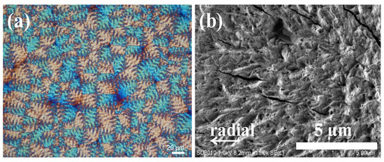 PET is known to be incapable of producing ring-banded spherulites at all crystallization temperatures and can be regarded as “hardly” ringed spherulites. Although ring-banded spherulites have been reported infrequently in PET, it has been demonstrated that some exceptions exist, with solution-cast PET films exhibiting an irregular ring-banded pattern. Supaphol et al. [55] studied PTT and PET blend’s thermal properties, and the results suggested that PTT was more crystallizable than PET. To begin the discussion on these diversified aryl polyester systems, first, we focused on poly(ethylene terephthalate) (PET). A consistent phenomenon was observed after conducting tests on PET under various crystallization conditions (covering from Tc = 210 °C to 225 °C) after 2 min of melting at 280 °C; an irregular ring-banded morphology was formed with “positive”-type spherulites. Owing to PET’s irregularly banded morphology, further characterization was conducted by using SEM to expose the surface morphology pattern. Figure 1 displays the irregular bands of PET film at Tc = 220 °C, which is composed of a fibrillar-stripe morphology with a zig-zag array. This fibrillar morphology spreads outward from the center of the nucleus toward the periphery radially. It is apparent from the fibrillar pattern that there is no distinguishable contrast between the ridges and valleys. For comparison, in Supplementary Materials, Figure S1 shows POM images for PET crystallized at a broad range of Tc = 200, 205, 210, 215, 220, and 230 °C.