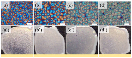 POM graphs and weak or non-iridescence of PET films crystallized at different crystallization temperatures (Tc): (a,a′) 210 °C; (b,b′) 215 °C; (c,c′) 220 °C; (d,d′) 225 °C, after being melted at Tmax = 280 °C for 2 min (scale bar = 40 μm).