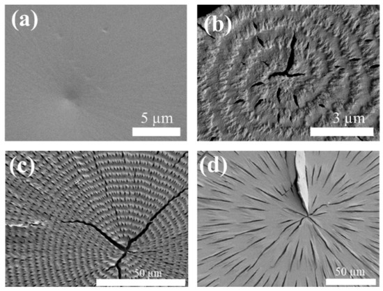 Figure 3 shows the SEM images for crystallized PTT films in a wide range of temperatures at Tc = from 90 °C to 175 °C. Ringless PTT spherulites are formed only at Tc < 90 °C (Figure 3a), and their surfaces are relatively smooth and lack an up-and-down topology compared to the regularly banded spherulites. Figure 3b demonstrates the marginal ring-banded morphology in PTT, which, nevertheless, creates highly organized structures in small-radius spherulites. The undulated morphology can be observed, which acts as a grating surface, resulting in a soft-hue iridescent color. Figure 3c clearly illustrates the ring-banded structures at Tc = 150 °C, where the distinct lamellae in the ridge and valley zones act as gratings to generate vivid structural coloration. With band spacing at ca. ~5.5 µm, interference can take place optimally and produce intense colors. Ring-banded spherulites with a wider band spacing (ca. ~40 µm) are formed at Tc = 175 °C, as shown in Figure 3d, and are unable to support sufficient interference. Furthermore, compared to the previous two ring-banded morphologies, there is a lower difference in elevation between the ridge and valley, leading to the absence of interference in this condition.