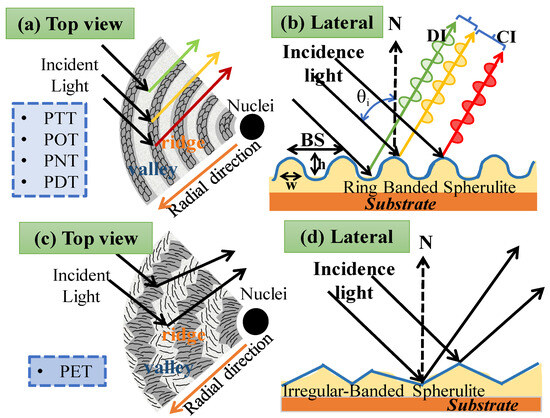 Some subscales of a hierarchical structure can act as holographic gratings when exposed to light, revealing the interference pattern as a result of the periodic assembly. Periodically banded crystals have ordered microstructures arranged in grating-like arrays that can interact constructively with some light wavelengths but not with others to produce spectral coloration. Figure 5 illustrates the interference between ring-banded morphology and irregular ring-banded morphology to generate color spectra. Figure 5a depicts arylate polyesters with regular ring-banded spherulitic structures when viewed from the top surface in conjunction with light. Simultaneously, incident light is reflected regularly and forms waves, as in Figure 5b, when viewed from the side. The mechanism of light interference can be explained by the fact that most of the sources produce white light waves that randomly travel in all directions. The situation means that light wavelengths emitting from a source do not have a constant amplitude, frequency, or phase. Moreover, once they reach the ridge and valley, they create an interference pattern that can be tuned to create color. The incident light splits into numerous beams that travel in different directions and generate constructive and destructive interference. Interference is the process by which two waves combine to form a combined wave of different or identical amplitude. By contrast, when PET crystallizes at a specific temperature range, it does not form the regular ring-banded morphology but rather an irregular ring-banded morphology reminiscent of fibrillar lamellae. Additionally, non-periodic disorderly microstructures were employed in the irregular banded and ringless structure, which do not support photonic reflection. No color interference is revealed because reflected light can travel randomly in any direction. The opposite situation from the previous phenomenon is illustrated in Figure 5c, where light is reflected in all directions when it strikes the surface of irregular ring-banded spherulites. The separation of the distance between the ridge and valley is too far in this case, resulting in no interference in this situation. This is related to the random reflection phenomenon. Moreover, as illustrated in Figure 5d, no coloration is produced by reflection from the irregular PET’s surfaces. Thus, a similar mechanism to nature’s photonic structures, the hierarchical grating and periodic orderly structure in polymers has a unique effect on iridescence, and the structural coloration takes this microstructure into account.