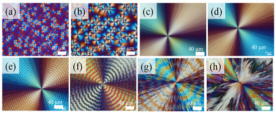 POM graphs of neat PTT crystallized at different crystallization temperature (Tc) values: (a) 90 °C; (b) 100 °C; (c) 140 °C; (d) 150 °C; (e) 160 °C; (f) 165 °C; (g) 175 °C; (h) 190 °C, after crystallized at Tmax = 260 °C for 5 min (scale bar = 40 μm).